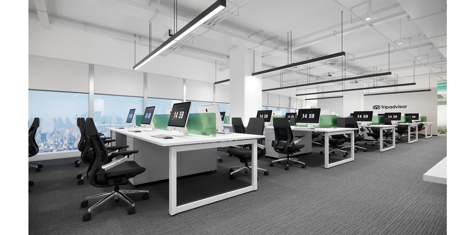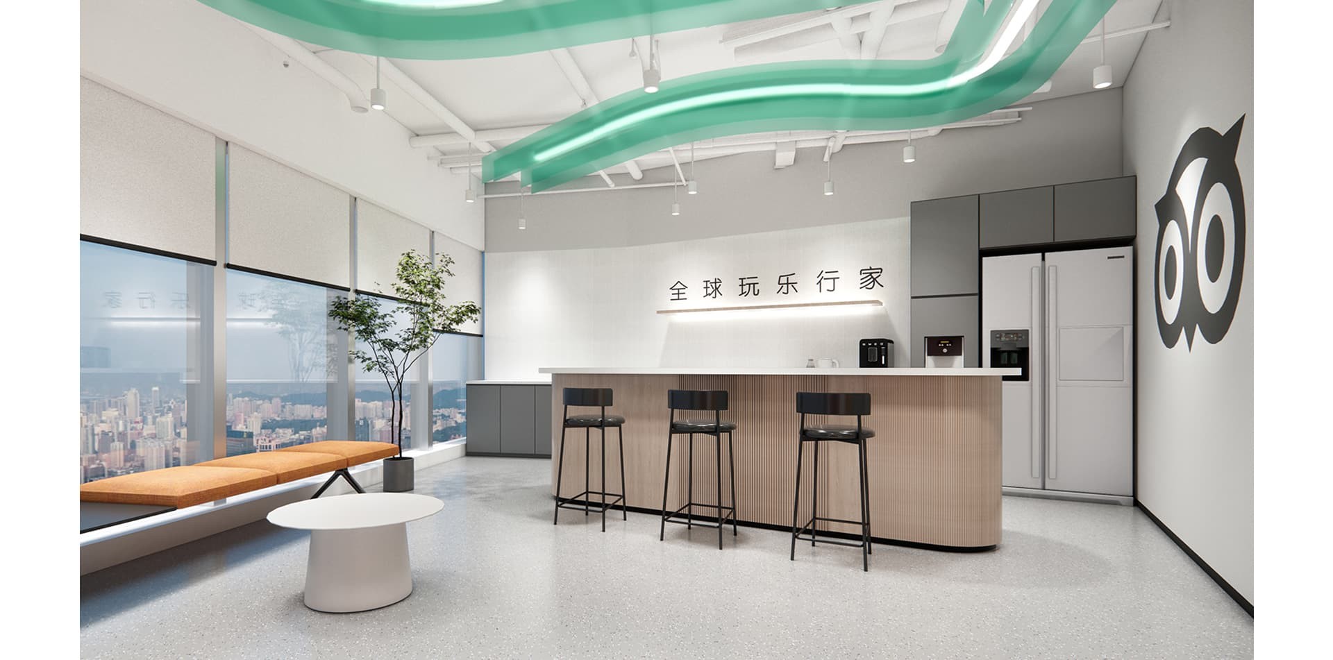貓途鷹辦公室裝修設(shè)計以?簡約靈動?為基調(diào),融入品牌標(biāo)志與?全球旅行元素?,搭配開放式布局與活力色彩,打造兼具協(xié)作效率與探索氛圍的辦公空間。