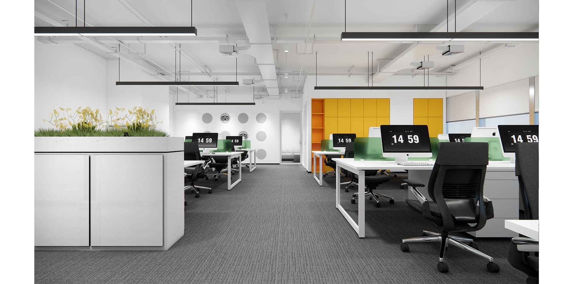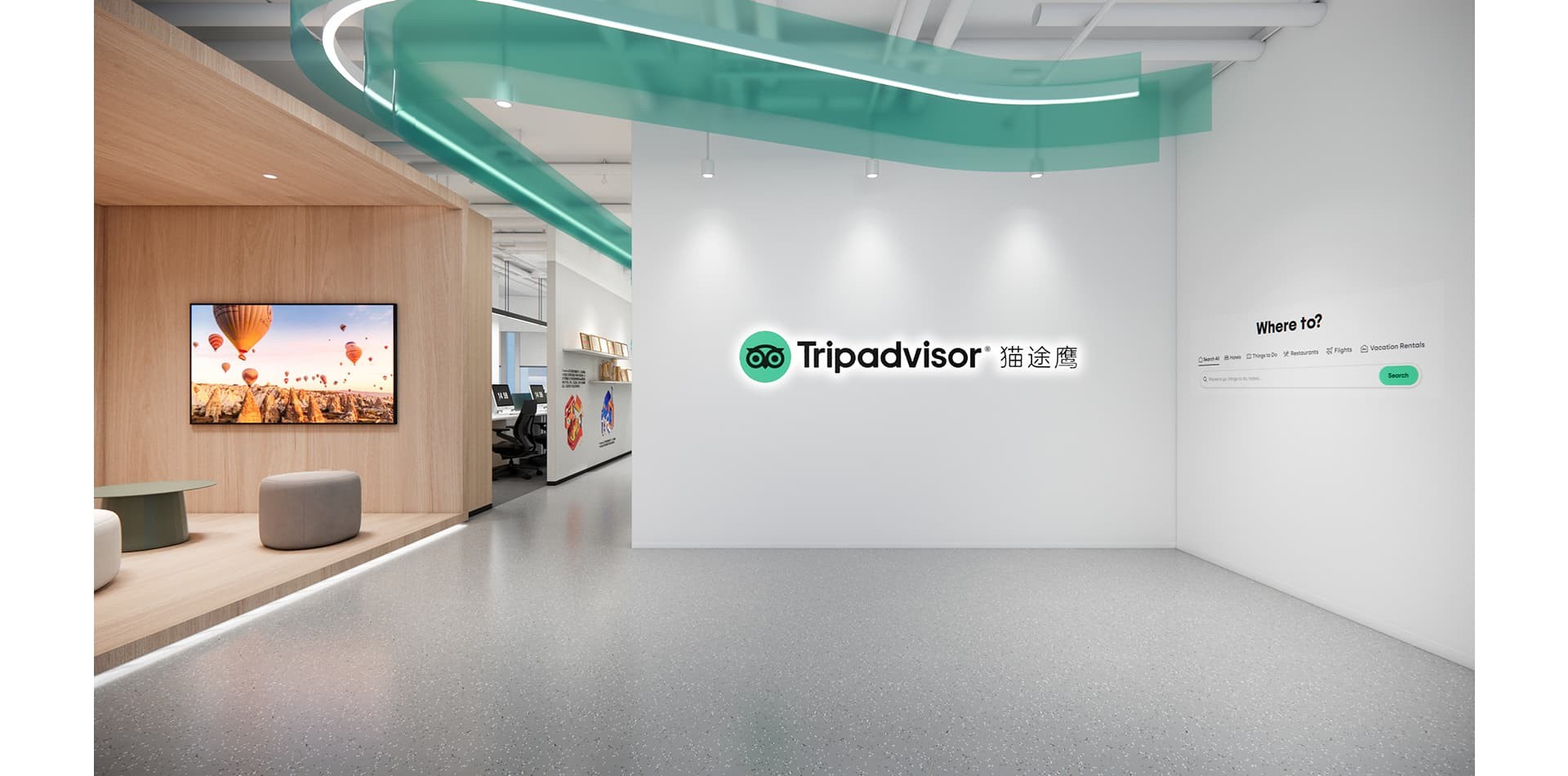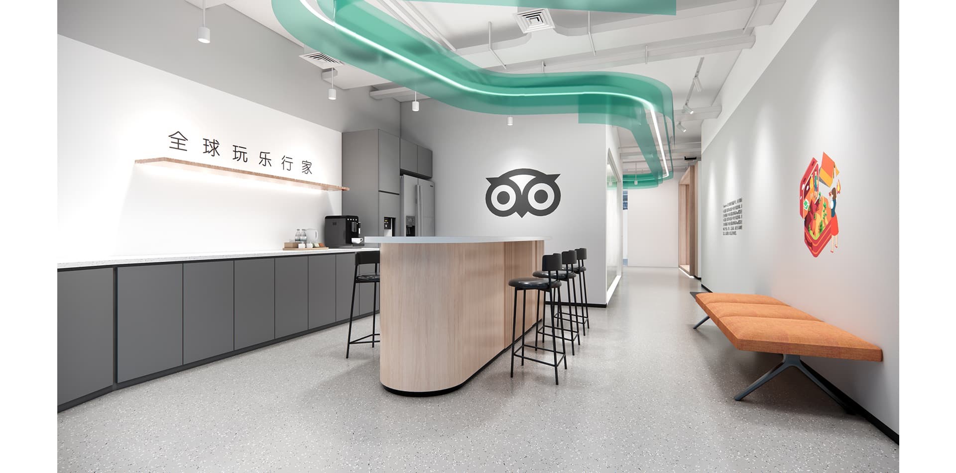 貓途鷹辦公室裝修設(shè)計以?簡約靈動?為基調(diào),融入品牌標(biāo)志與?全球旅行元素?,搭配開放式布局與活力色彩,打造兼具協(xié)作效率與探索氛圍的辦公空間。