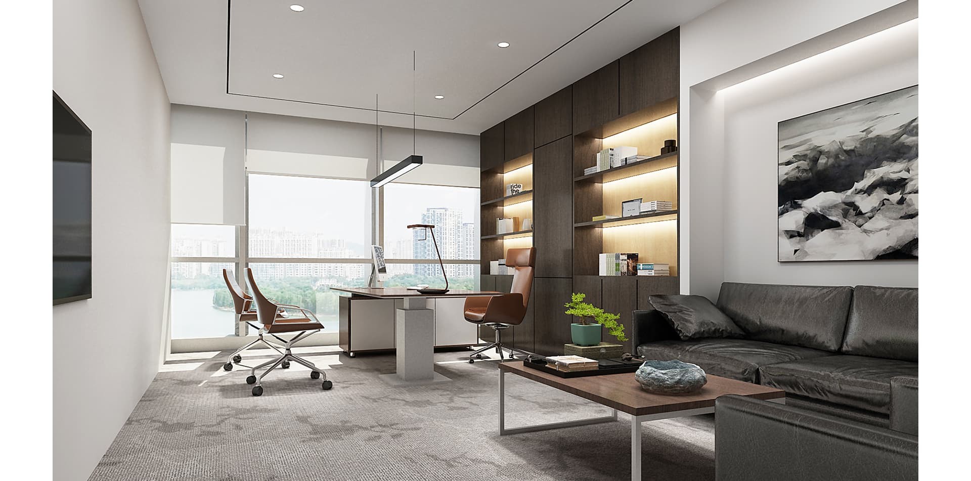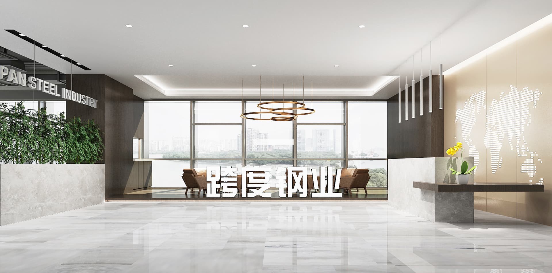 跨度鋼業(yè)辦公室裝修設(shè)計(jì)以?鋼結(jié)構(gòu)?為視覺核心,搭配?玻璃隔斷?與?木質(zhì)元素?,營造?通透大氣?的辦公氛圍,兼具工業(yè)風(fēng)粗獷質(zhì)感與現(xiàn)代辦公的開放協(xié)作屬性。